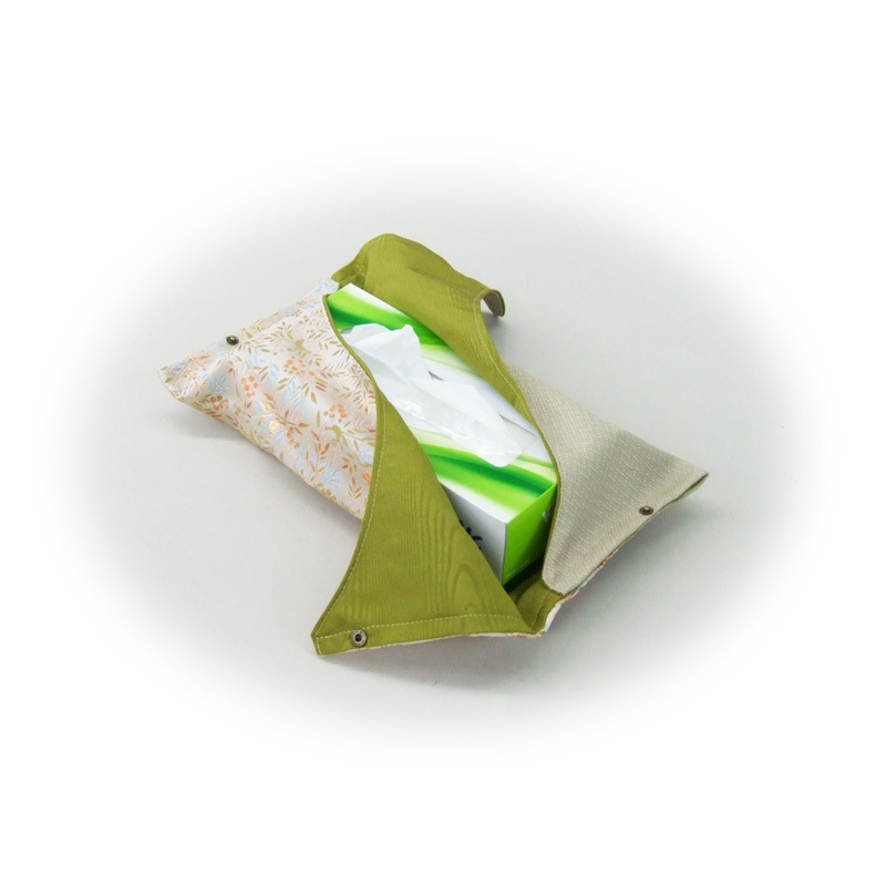 日本の伝統織物の金襴と無地感の高級ジャガード織を組み合わせたティッシュカバーです。お部屋のイメージをこわさず、和室にも洋室にも合うよな和モダンな製品です。金襴の布は、薄いベージュ色の地糸に小鳥(瑞鳥)と南天文を可愛らしく織り込んだ和柄織物を使用。組合せのベージュ色の布には、光沢のある糸とつや消しの糸をミックスした織物で、細かなジグザグの波模様が見える布を使用したカバーとなっております。 別誂えで、同じ柄の収納バックやクッションカバーもお作りすることもできますので、お部屋のトータルコーディネートが可能です。ティッシュ箱のサイズが、約W240mm×H65mm×D110mmまでであればご使用可能です。