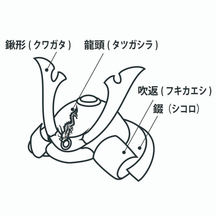 日本の伝統織物『金襴』で作った布製の兜(かぶと)です。本物の兜の中央に装飾されている竜頭(たつがしら)のかわりに金糸で織り込んだ竜の柄をあしらいました。竜柄には『出世・飛躍』などの意味合いがあり縁起が良いと言われています。また、鍬(くわ)をかたどったところから由来されている、鍬形(くわがた)を鹿の角のように付け、威厳を添える前立物となっています。兜の左右両端の折り返した部分を吹き返しといい、刀や弓矢から頭を守るために工夫されており、素材にスウェード調の唐獅子牡丹のプリントの布を使用することにより、より本物感を表現しました。節句のお祝いやコスプレの衣装としてかぶっていただけば大いに盛上ることでしょう。LサイズととSサイズをご用意しておりますので親子お揃いでかぶることができます。安心の日本製。